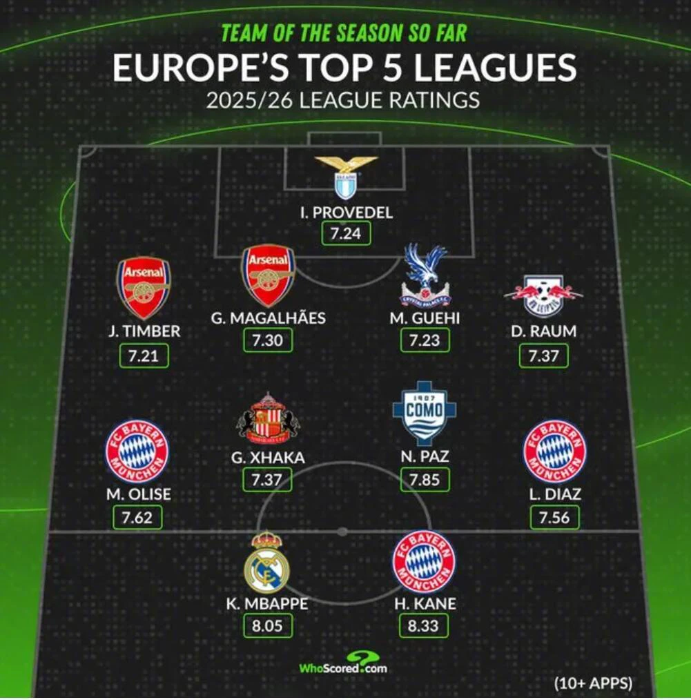 前锋:奥利塞(7.62)、姆巴佩(8.05)、凯恩(8.33)、迪亚斯(7.56)