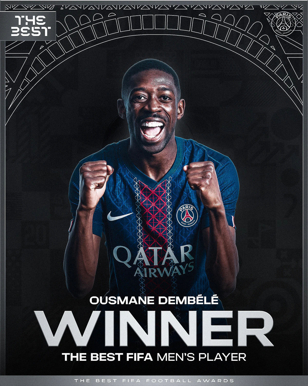 在2024至2025赛季,28岁的登贝莱代表巴黎圣日耳曼队出战53次,打进35球并有16次助攻,帮助球队夺得法国杯、法超杯、法甲和欧冠4项冠军。此外,登贝莱还获得了法甲金靴、法甲最佳球员、欧冠最佳球员等个人荣誉,并在9月底收获了2025年金球奖。此次加冕世界足球先生,登贝莱完成了对金球奖和世界足球先生两大年度重磅奖项的包揽。