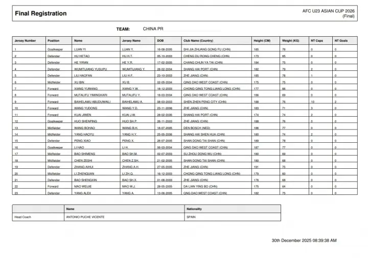 在这份名单中,王钰栋作为锋线核心,凭借出色的得分能力和比赛气质,成为球队进攻的关键人物。中场球员王博豪的入选也备受关注,他目前效力于荷兰邓伯什队,展现了中国年轻球员的海外实力。此外,蒯纪闻、拜合拉木等球员也在各自俱乐部中表现出色,为国家队注入了新的活力。