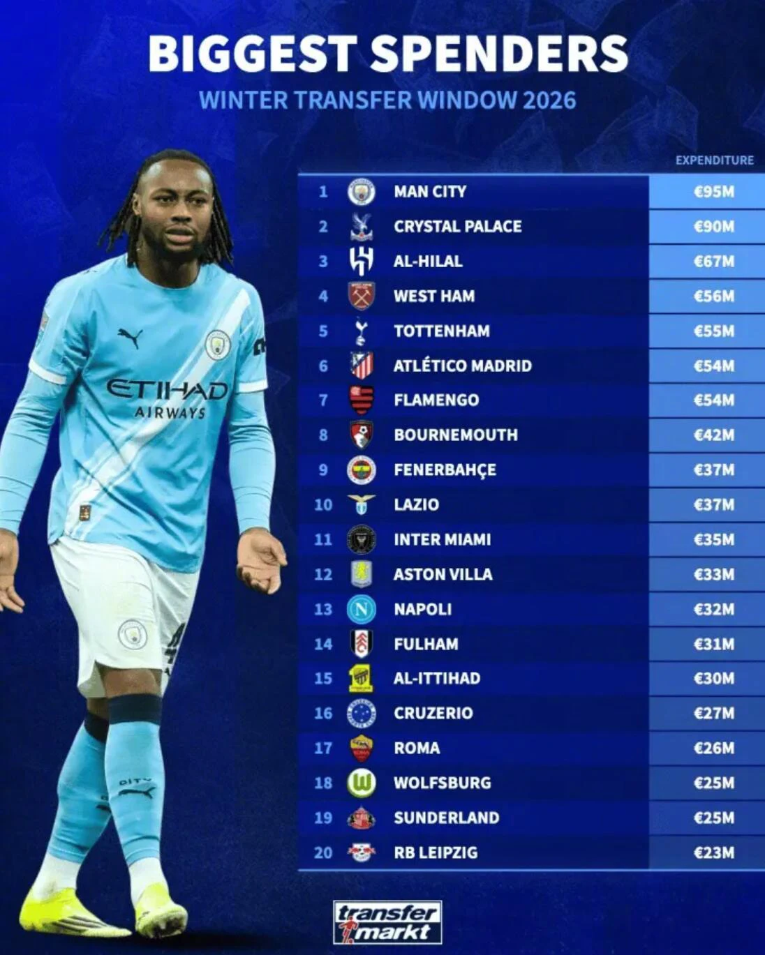 1、曼城——9500万欧元