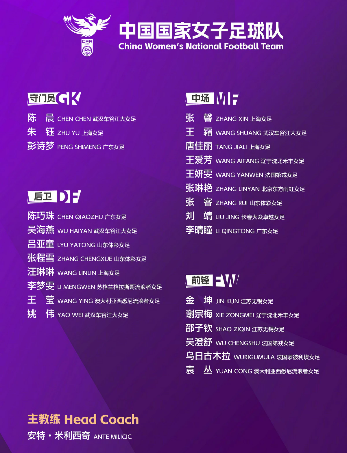 后卫:2-王莹(西悉尼流浪者女足)、3-陈巧珠(广东女足)、4-汪琳琳(上海女足)、5-吴海燕(武汉车谷江大女足)、20-张程雪(山东体彩女足)、21-李梦雯(格拉斯哥流浪者女足)、25-吕亚童(山东体彩女足)