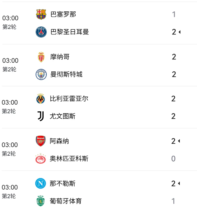 在摩纳哥路易二世球场,曼城客场挑战摩纳哥。比赛第15分钟,哈兰德接格瓦迪奥尔助攻挑射破门,曼城取得领先。第18分钟,摩纳哥中场泰泽远射扳平比分。第44分钟,哈兰德头球破门,曼城再次领先。第90分钟,摩纳哥后卫戴尔点球扳平比分,最终曼城2-2战平摩纳哥。阿森纳2-0奥林匹亚科斯:马丁内利、萨卡建功,阿森纳轻松取胜