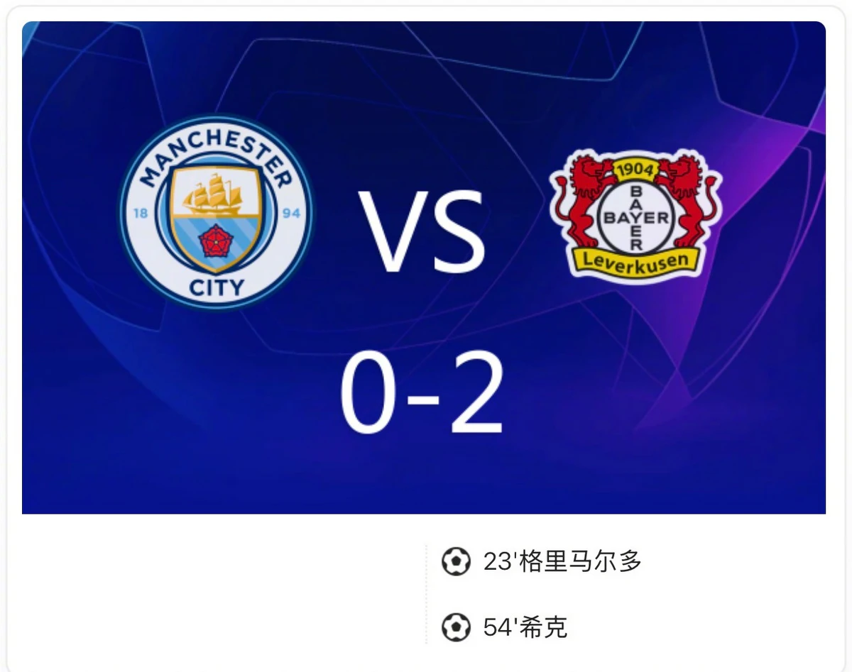 比赛第23分钟,勒沃库森率先发难。科法内禁区内巧妙回做,边后卫格里马尔多迎球怒射破门,斩获个人本赛季各项赛事第8球,这一数据已是他上赛季全年总进球数的两倍。易边再战,瓜帅在第46分钟连换三人加强攻势,但第54分钟,格里马尔多精准传中助攻,希克力压曼城中卫阿克高高跃起头槌破门,将比分扩大为2-0。