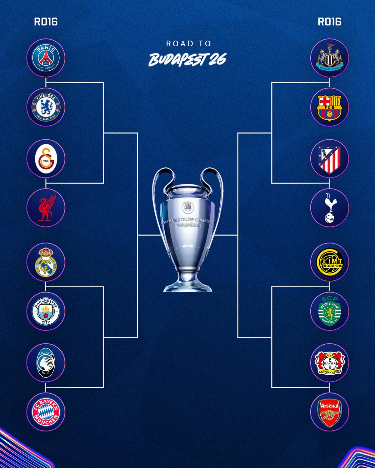 本赛季欧冠淘汰赛采用新赛制,16强抽签确定后,1/4决赛和半决赛的对阵路径也随之固定,不再进行后续抽签。种子队(联赛阶段前8名)拥有先客后主的赛程优势。上半区(死亡半区):
