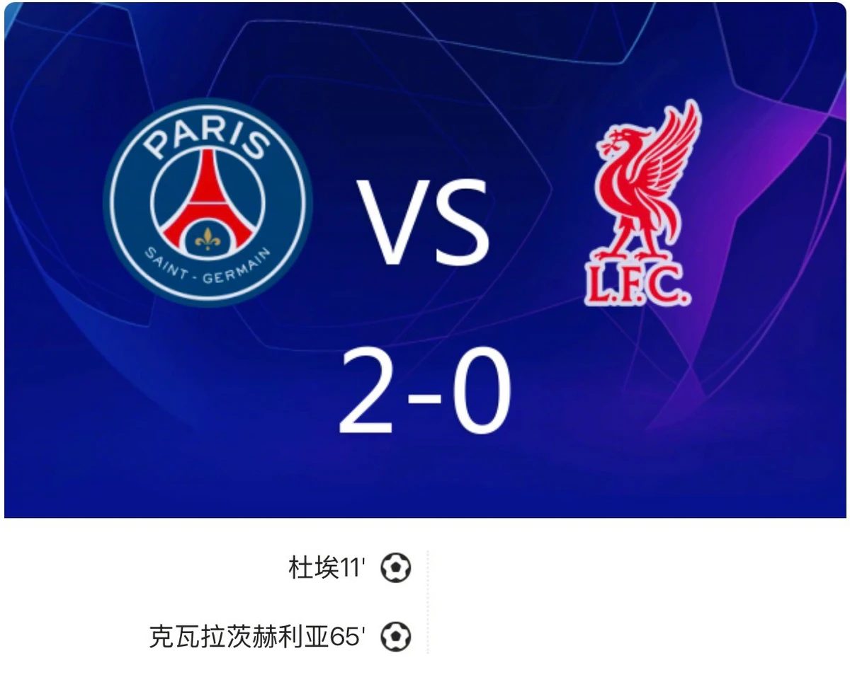 - 进球数:巴黎2球 - 利物浦0球