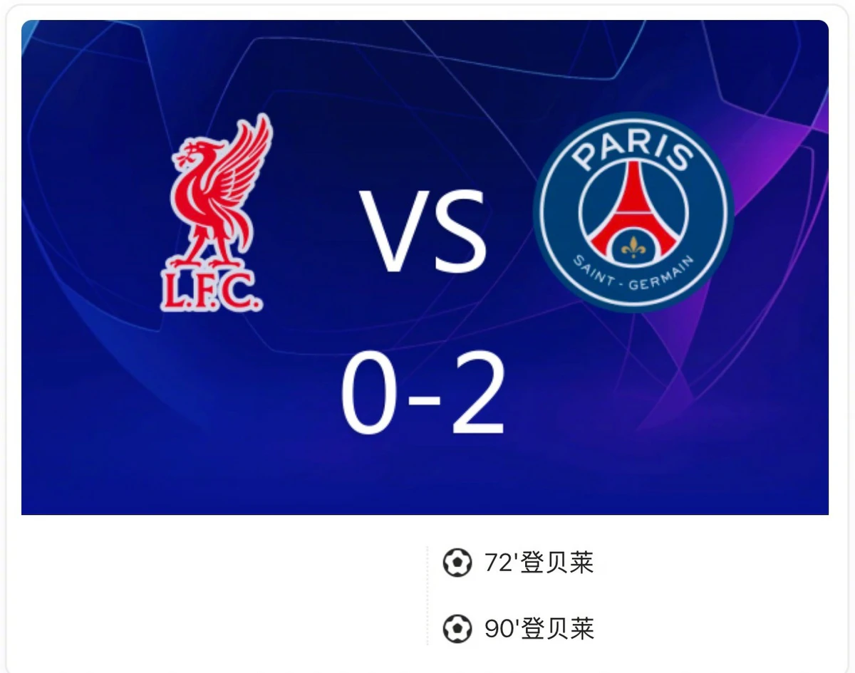 易边再战,第63分钟,麦卡利斯特禁区内被帕乔放倒,主裁判最初判罚点球,但经VAR介入后取消,利物浦错失扳平良机。第72分钟,登贝莱禁区弧顶轰出世界波,巴黎1-0领先,总比分3-0基本锁定胜局。补时第91分钟,索博斯洛伊传球被断,巴黎快速反击,登贝莱推射空门完成梅开二度,将比分定格在2-0,总比分4-0彻底终结悬念。