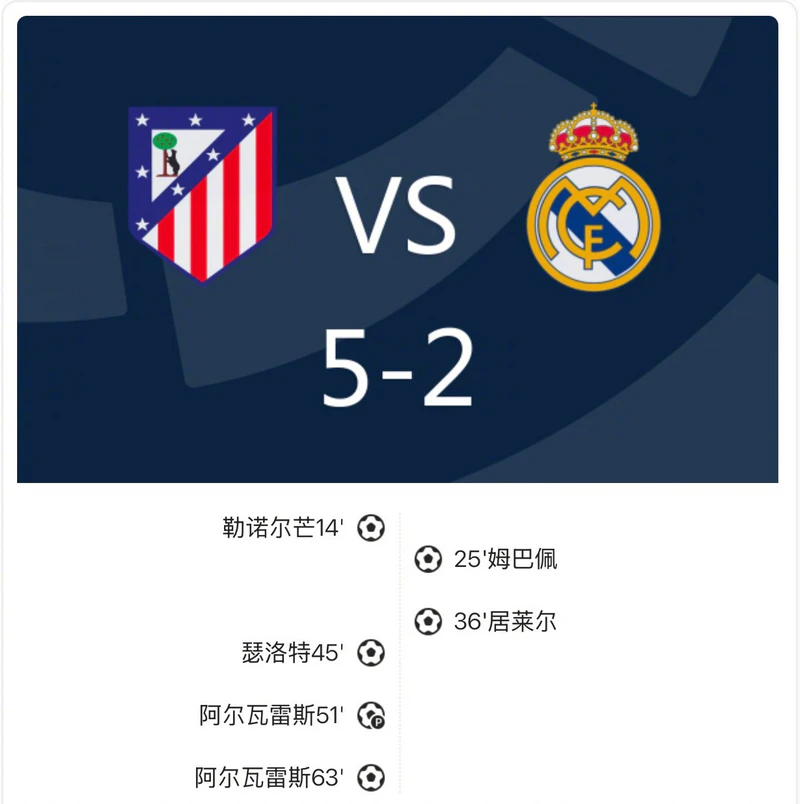 下半场,比赛进入高潮。第51分钟,居莱尔在禁区内抬脚过高送点,阿尔瓦雷斯点球命中,马竞3比2领先。第63分钟,阿尔瓦雷斯再次发威,他主罚的任意球越过人墙,直挂死角,将比分扩大为4比2。第90+3分钟,巴埃纳断球推进送助攻,格列兹曼推射破门,将比分锁定为5比2。