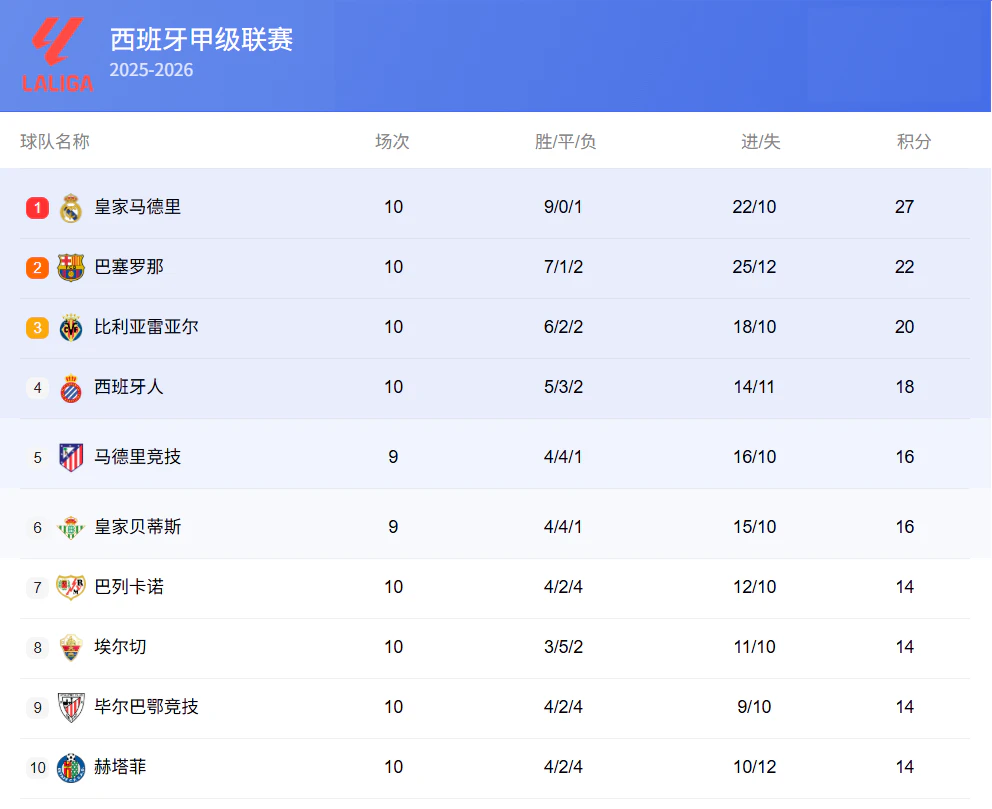 - 皇家马德里 10战 9胜 0平 1负 27分(净胜球+12)