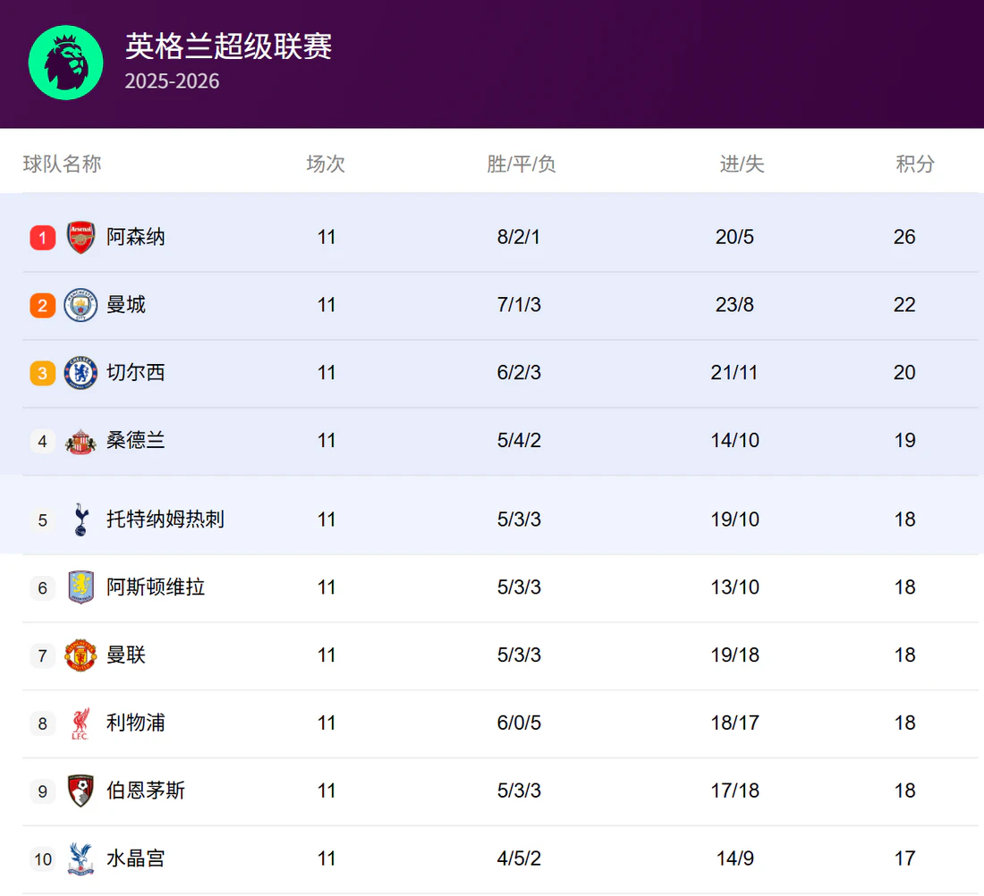 - 阿森纳以26分领跑积分榜,领先第二名曼城4分。