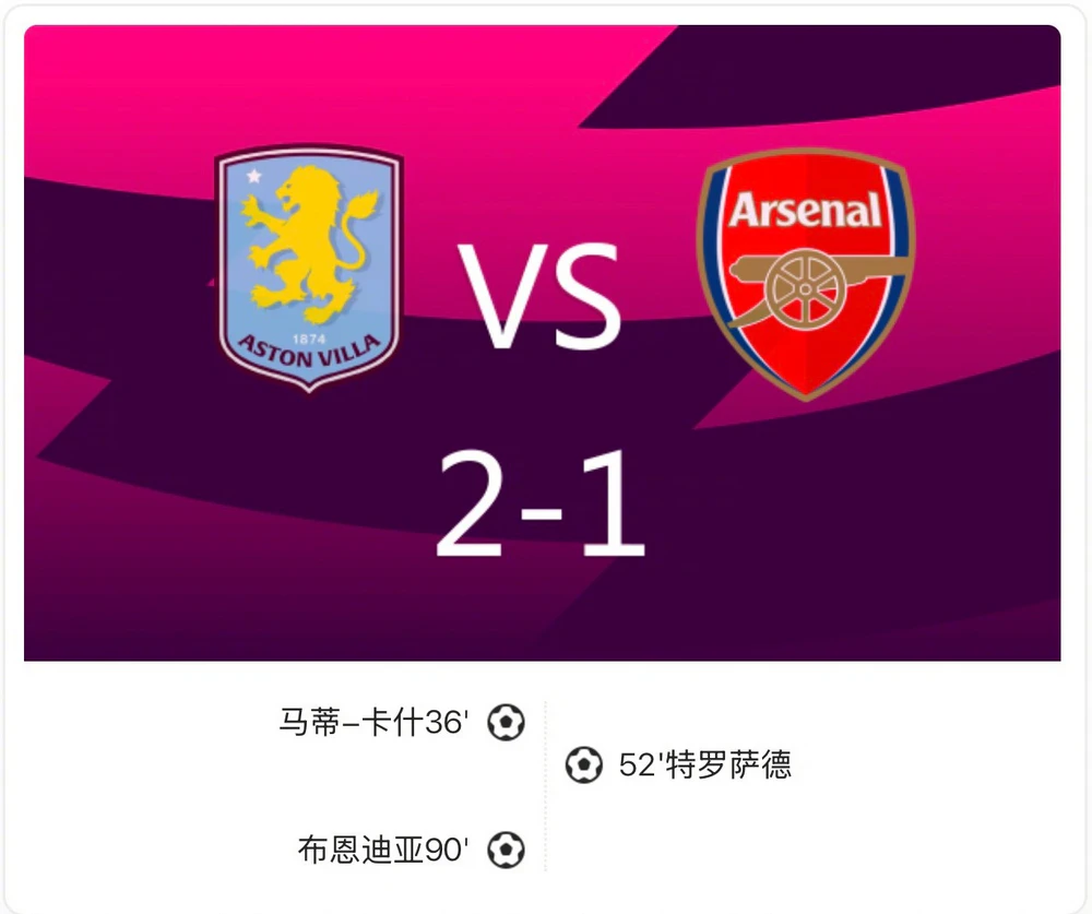 下半场易边再战,阿森纳迅速调整节奏。第52分钟,特罗萨德接萨卡横传扳平比分,两队回到同一起跑线。然而,在下半场补时第4分钟,因卡皮耶带球失误送了界外球,布恩迪亚乱战中上演读秒绝杀,最终维拉2-1战胜阿森纳。