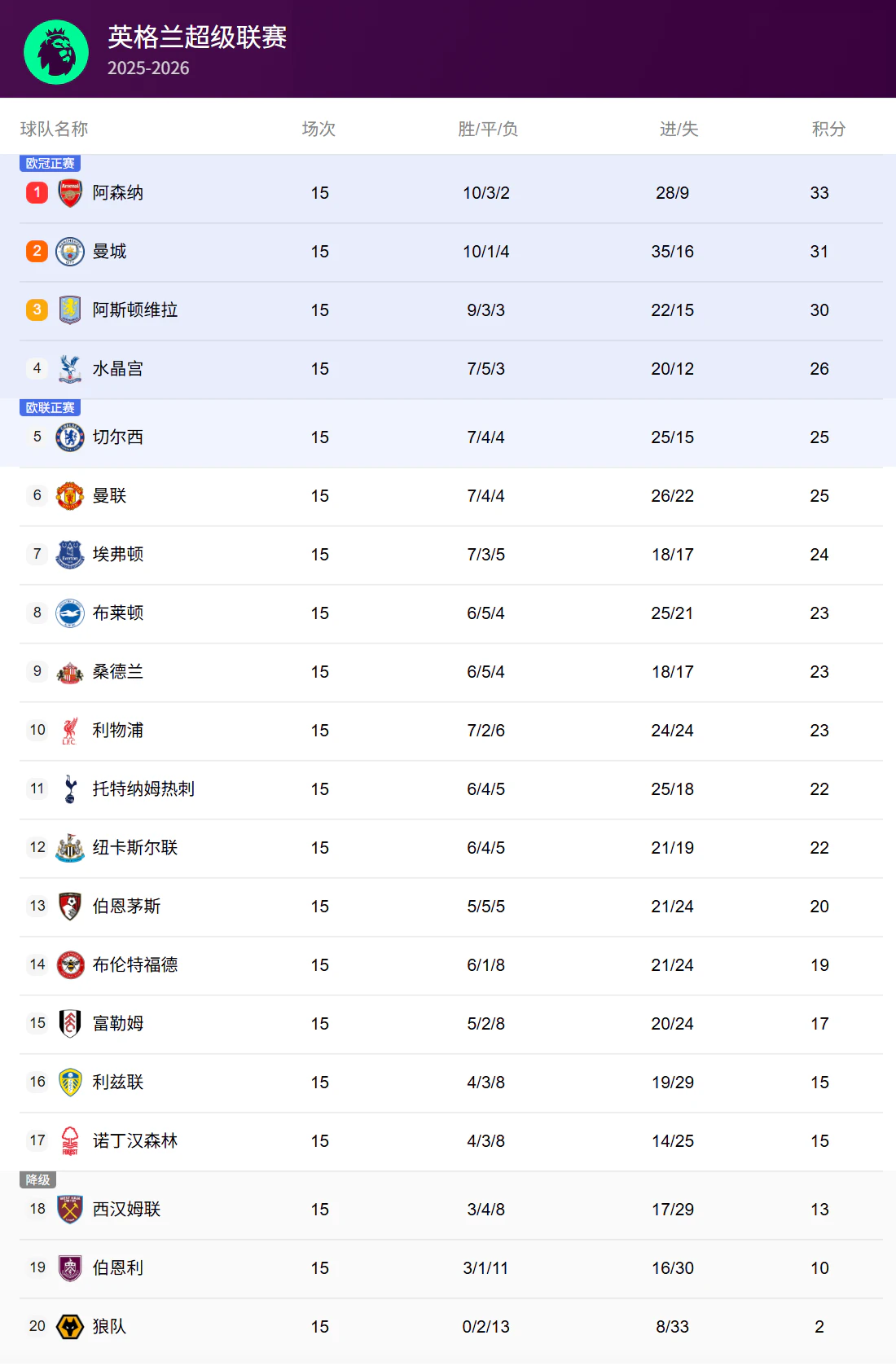 本轮焦点战中,阿森纳在客场以1-2不敌阿斯顿维拉,遭遇读秒绝杀,爆出大冷门。而曼城则以3-0轻松战胜桑德兰,取得三连胜。目前,阿森纳以33分领跑积分榜,但领先优势仅剩2分,曼城以31分紧随其后,阿斯顿维拉凭借五连胜积30分跃升至第三。阿森纳近五轮比赛丢掉7分,争冠前景受到严峻考验。