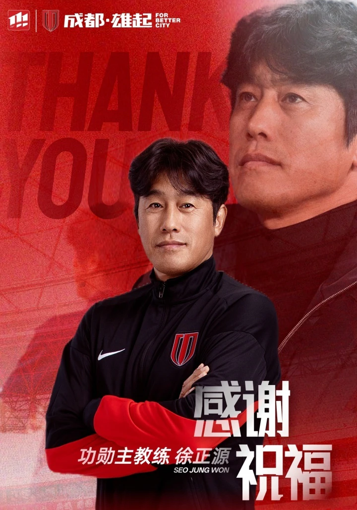 经友好协商,成都蓉城足球俱乐部与徐正源先生达成一致,决定不再续约,徐正源先生将不再担任成都蓉城足球俱乐部一线队主教练职务。在此,俱乐部全体成员谨向徐正源先生及其教练团队致以最诚挚的谢意。2021年1月起,徐正源先生担任俱乐部一线队主教练,为俱乐部带来了先进的足球理念、严谨的职业态度和永不言弃的拼搏精神。2022年,徐正源先生带领球队成功冲超,成都足球再次登上中国足球顶级职业联赛。从2022年中超第五的惊艳亮相,到2023年勇夺中超第四的强势崛起,再到2024年位居中超第三并历史性闯入足协杯四强,球队一步一个台阶持续攀升。2025赛季,更是登上亚冠精英联赛舞台,让成都足球的风采闪耀于亚洲足坛!为感谢徐正源先生为球队做出的卓越贡献,俱乐部决定授予其成都蓉城足球俱乐部“功勋主教练”称号。